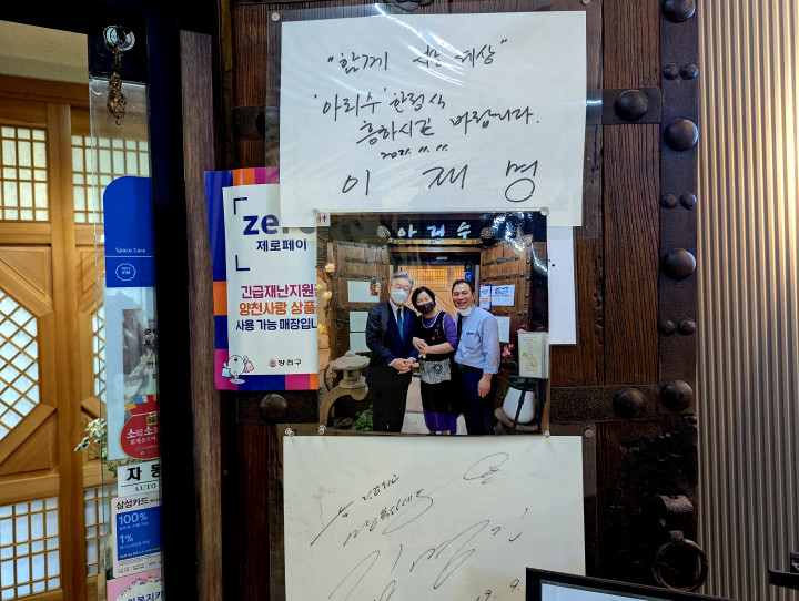 식당 입구에는 이 식당에 가끔 들렀다는 이재명 대통령 사진이 걸려 있었다.