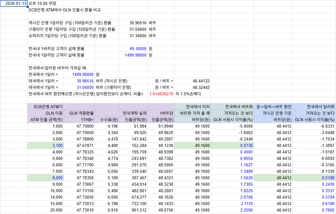 3100바트 이상 인출하면 한국에서 바트화 가져오는 것보다 이익.