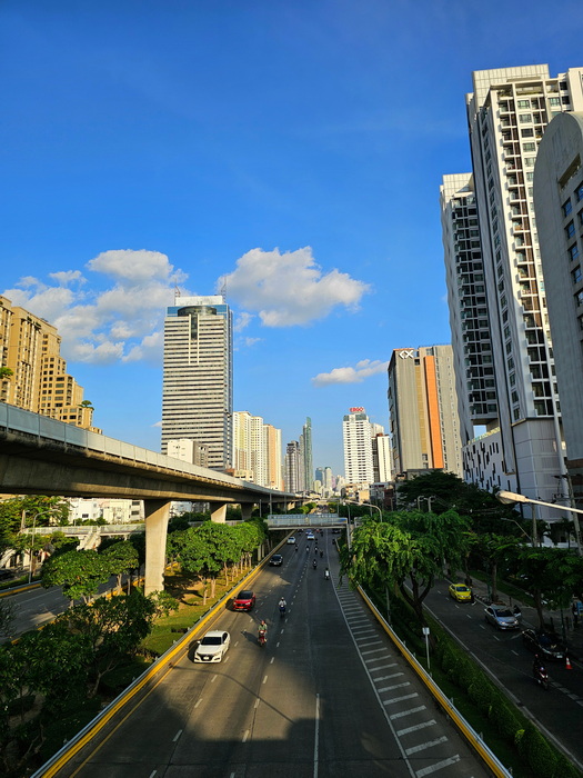 BTS가 지나는 끄룽톤부리 도로는 꽤 넓고 차들이 쌩쌩 다니는 데다가 횡단보도도 잘 없습니다.